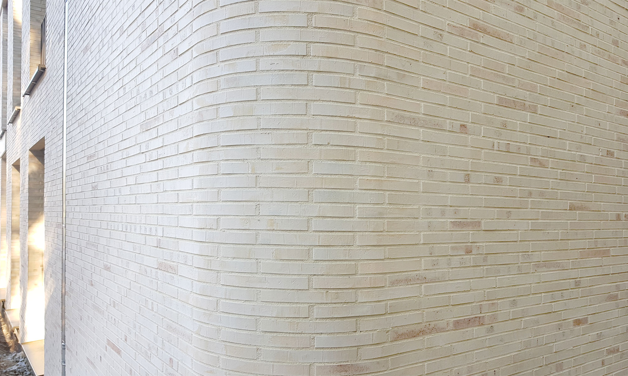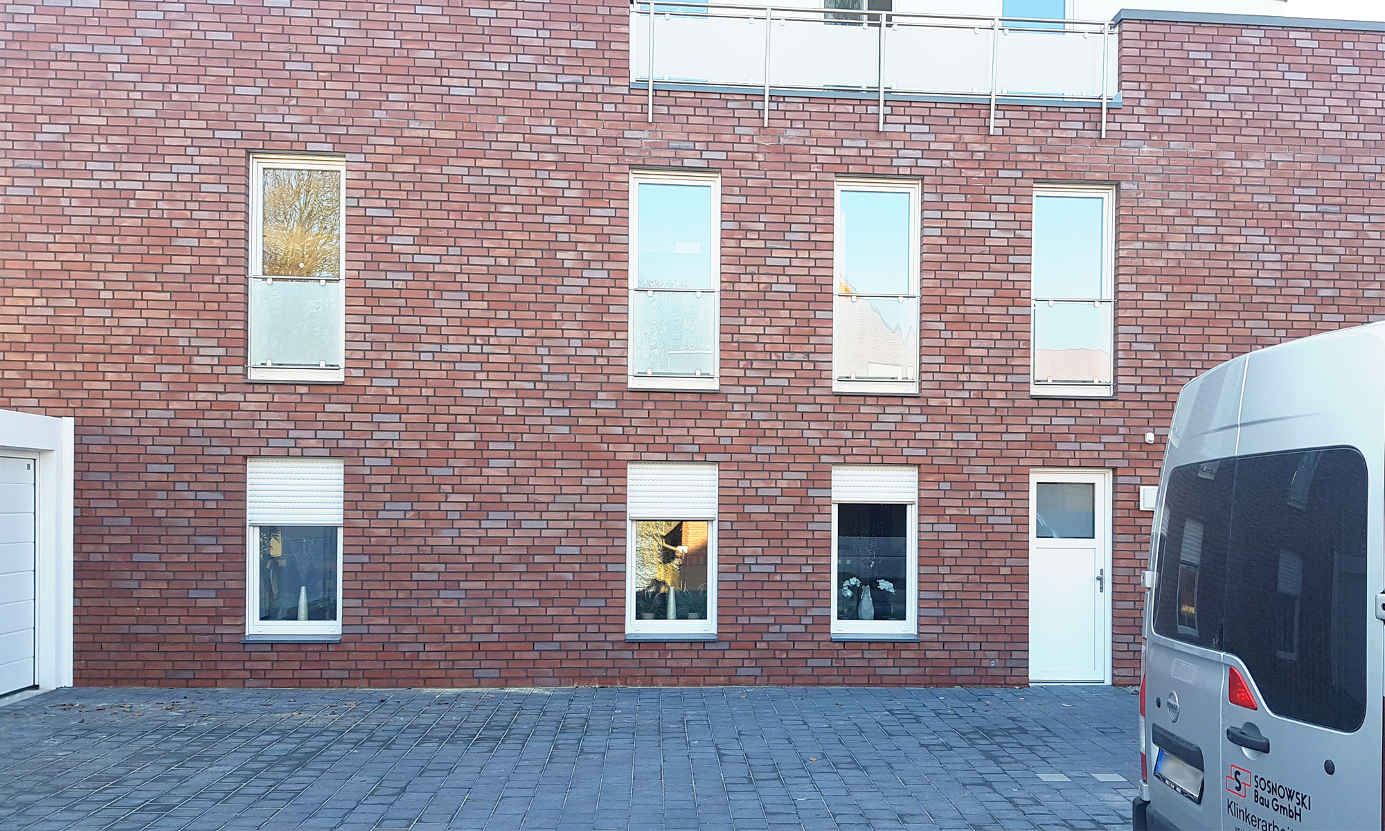 Verblendmauerwerk ca. 3000m². Herstellen der Verklinkerung mit einen DF-Klinker im Wilden Verband-Spezielles Mauerwerk von schrägen Wandabschnitten in Fenstern. Fertigteistürze Montag auf Konzole.